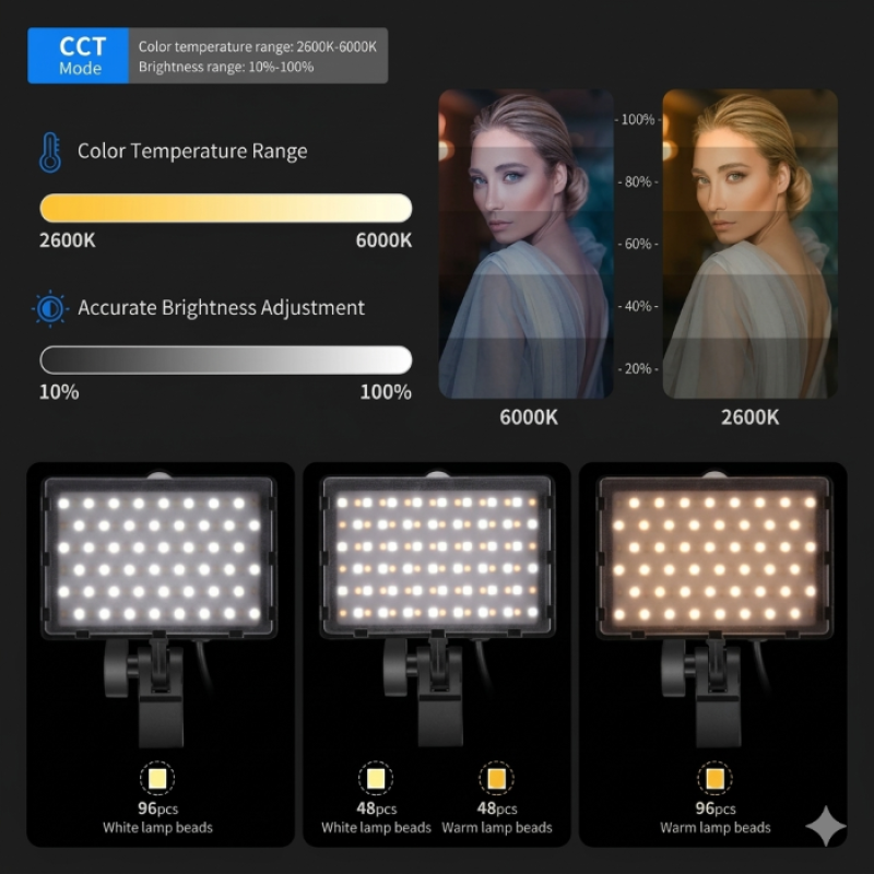 - Bi-color mode (2600K–6000K) + RGB lighting mode