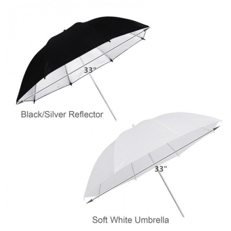 The white translucent umbrella can be used as a shoot-through or bounce umbrella, while the silver/black reflective umbrella provides stronger light output with enhanced contrast and skin tone rendering.